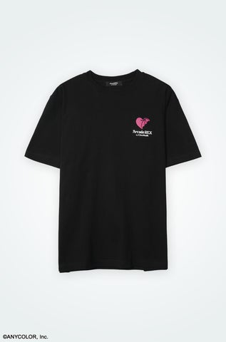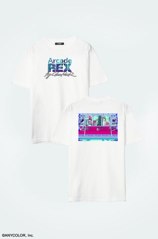 メインビジュアルの世界観を日常のアパレルに昇華した特別な一着です。バックプリントにはメインビジュアル、フロントには「Arcade REX by ChroNoiR」のロゴの中に都会的でサイバーパンクな風景が切り取られています。