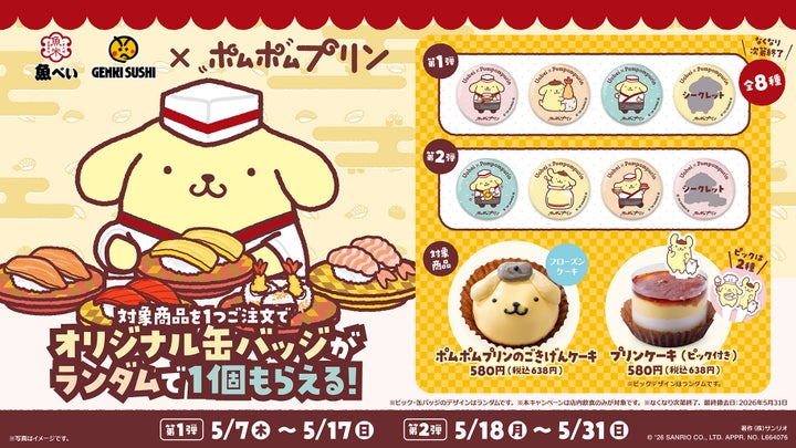 魚べい・元気寿司は、2026年5月7日(木)より人気キャラクター「ポムポムプリン」とのコラボキャンペーンを実施します。期間限定のオリジナルスイーツや、限定デザインの缶バッジプレゼントなど、盛りだくさんの内容です。開催内容や参加方法を詳しく紹介しますので、ぜひ参考にしてください。