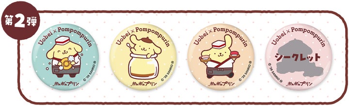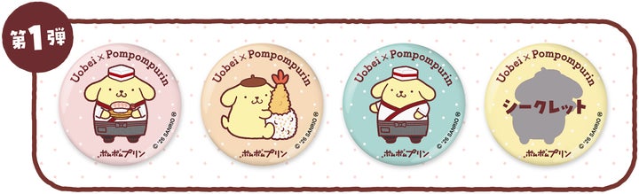缶バッジのデザインは、第1弾と第2弾で異なる4種ずつが登場し、それぞれ1種ずつシークレットデザインも含まれます。板前さん姿や「おしごと中」のポムポムプリン、えび天巻や特製プリンなど魚べいの人気メニューをテーマにしたデザインなど、コラボならではのモチーフを楽しめます。