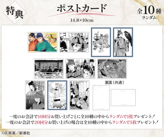 - 一度のお会計で10回分購入ごとに特典ポストカード(全10種)の中からランダムで1枚をプレゼントします。