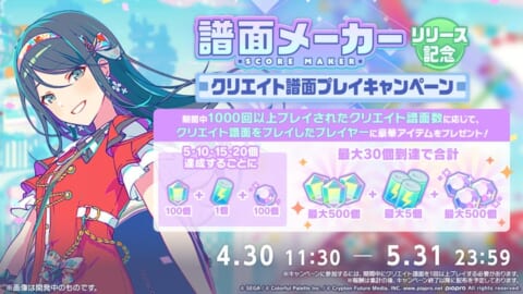 ゲーム内に実装される新機能「譜面メーカー」では、既存楽曲でオリジナルの譜面を作成できます。リリースを記念し、「クリエイト譜面プレイキャンペーン」を実施します。期間中、1,000回以上プレイされたクリエイト譜面数に応じ、プレイしたプレイヤーへ豪華アイテムを贈呈します。