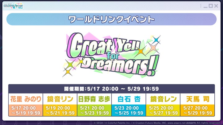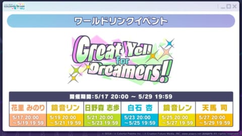 ワールドリンクイベント「Great Yell for Dreamers!」を2026年5月17日(日)20:00から2026年5月29日(金)19:59まで開催します。今回のイベントはユニットをシャッフルした特別なメンバー構成です。