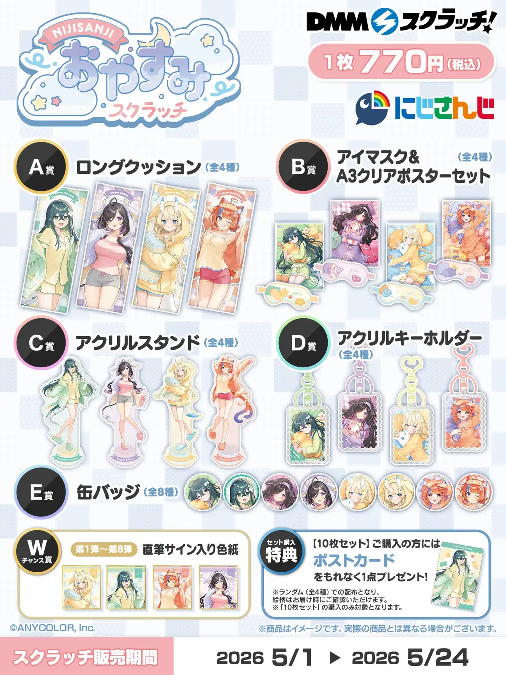 DMMスクラッチは、2026年5月1日18時より「にじさんじ「おやすみ」スクラッチ」を販売します。DMMスクラッチ限定の撮りおろしビジュアルグッズと、ライバー直筆サイン入り色紙が当たるWチャンス賞を用意。開催内容や参加方法を詳しく紹介するのでぜひ参考にしてください。