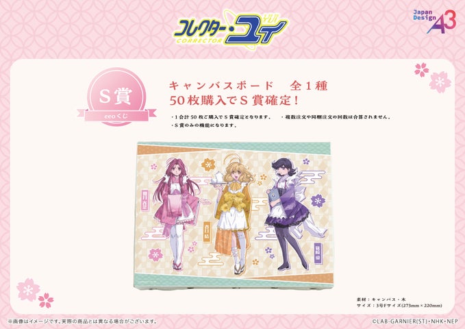 最もレアなS賞は、本物のキャンバス生地を使用した3号Fサイズ(約22cm×27cm)のキャンバスボードです。キュートな和装の春日結、如月春菜、篠崎愛の可愛さを存分に味わえる逸品となります。S賞は、1会計で50回購入すると確実に手に入ります。