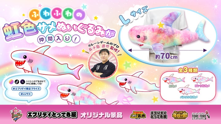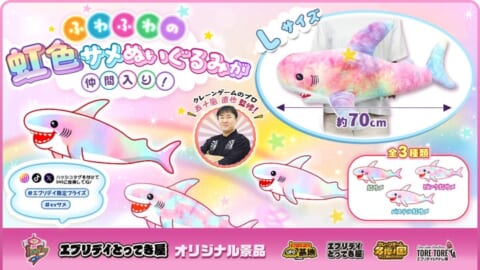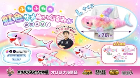 約70cmの巨大な「虹色サメぬいぐるみLサイズ」が、クレーンゲーム景品として2026年4月15日より順次登場しました。全3種類のカラフルなデザインが特徴で、SNS映えも抜群です。本記事では、このぬいぐるみの詳細や入手方法を詳しく紹介しますので、ぜひ参考にしてください。