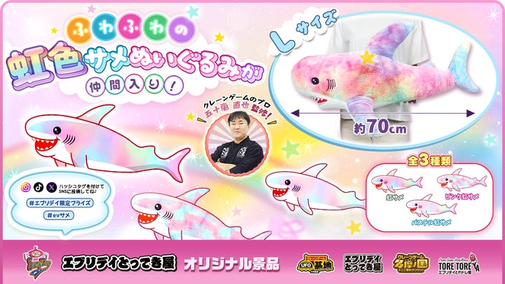 「虹色サメぬいぐるみLサイズ」は、以下のエブリデイ各店舗のクレーンゲームで獲得できます。順次登場のため、訪問前に店舗への確認をおすすめします。
