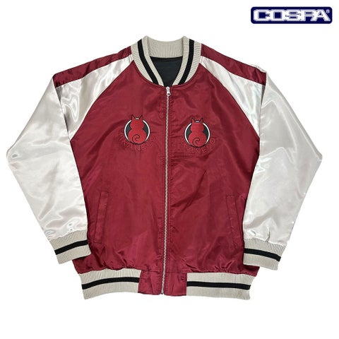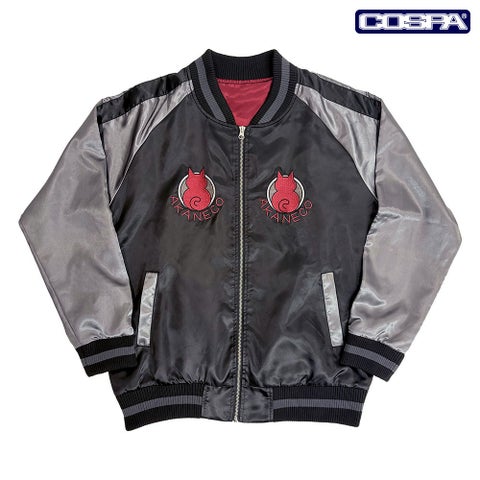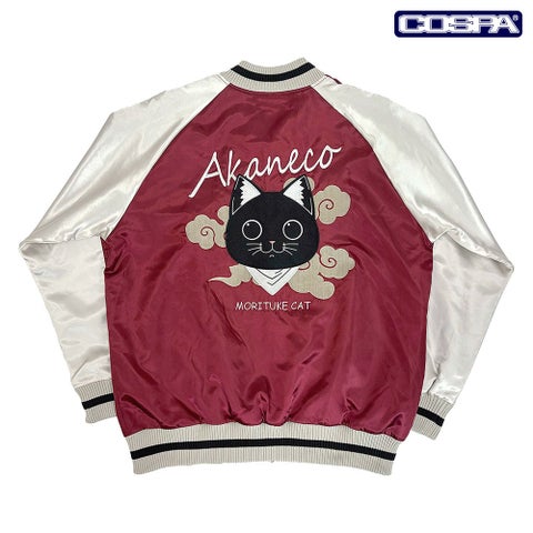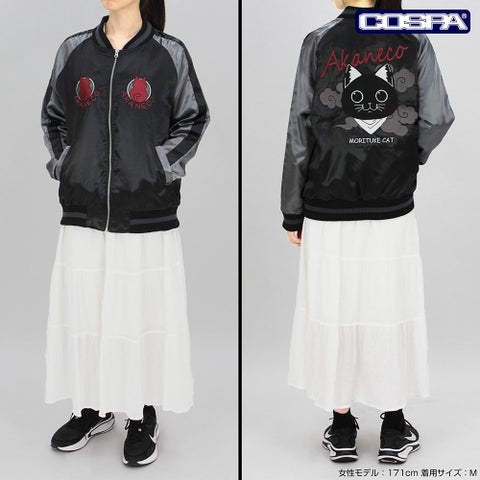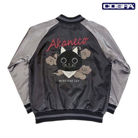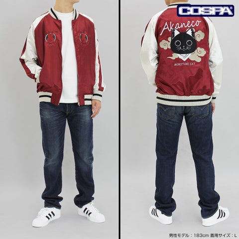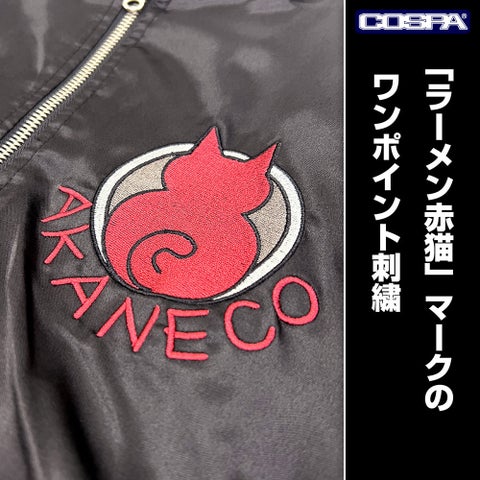 - 胸元には「ラーメン赤猫」マークがシンプルに刺繍されており、背面にはサブの可愛らしさと格好良さを両立させたデザインが刺繍で再現されています。