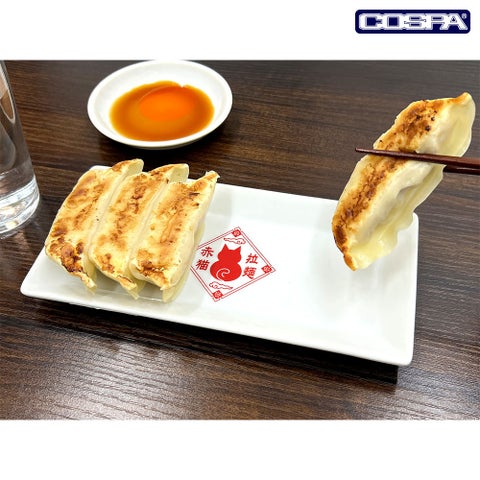 - 「ギョーザおまちーーー」というセリフが聞こえてきそうな、ラーメン赤猫をイメージしたデザインが施されています。