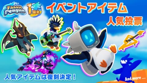 『Faaast Penguin』は、Nintendo Switch、PlayStation 5、Xbox Series X|S、PC(Steam, Epic Games Store)にて基本プレイ無料で配信中です。この機会にぜひプレイを開始し、コラボレーションイベントや1周年記念イベントにご参加ください。