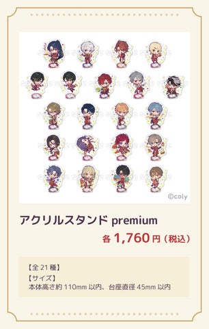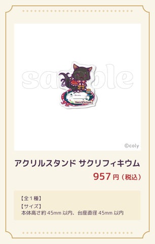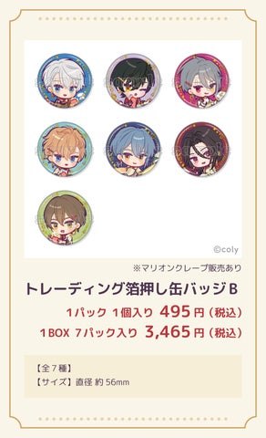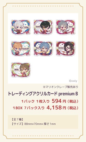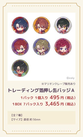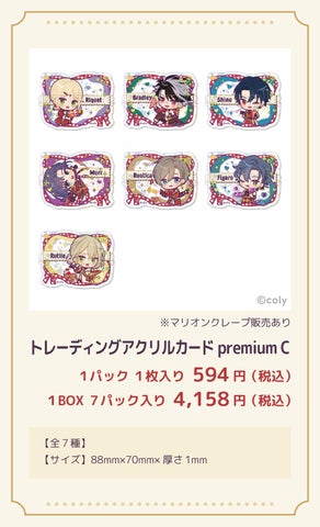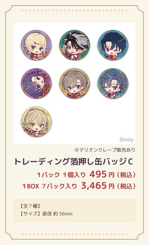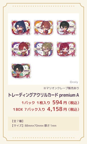 - マリオンクレープ コラボ実施店舗で販売されるグッズは、「トレーディング箔押し缶バッジ」と「トレーディングアクリルカードpremium」のみとなります。