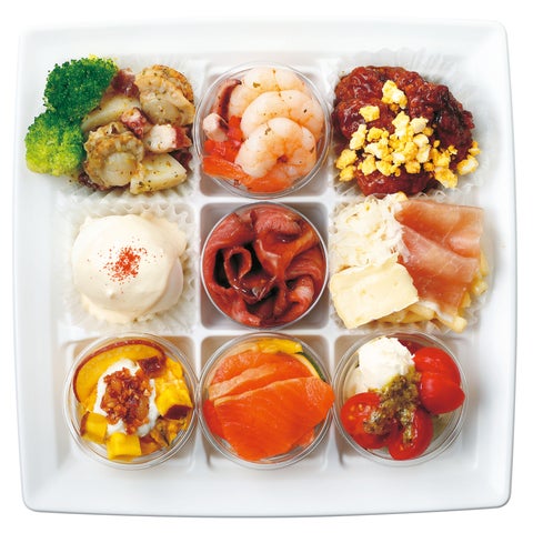 - 「たことホタテとブロッコリーのバジルサラダ」や「いかと海老のオリーブオイル仕立て」など、こだわりの9品を盛り合わせたオードブルです。