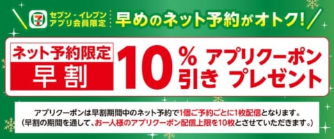 早割期間中にネットサービス「セブンミール」で予約すると、セブン‐イレブンアプリに一部商品を対象とした10%引きクーポンが配信されます。