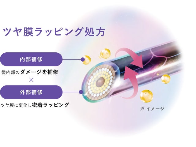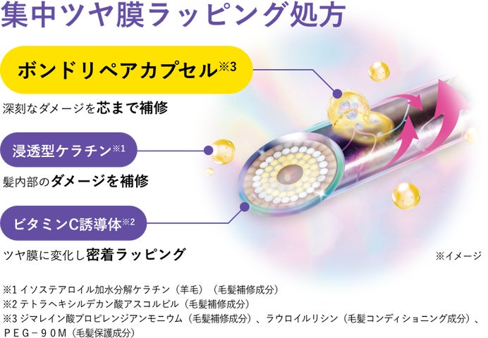シャンプー・トリートメントには、髪の保護膜の働きを補う「ツヤ膜ラッピング処方」が採用されています。浸透型ケラチン*5とビタミンC誘導体*6により、カラーやパーマで傷んだ髪の内側と外側の両方にアプローチし、ぷるんとうるおうツヤ髪へ導くのが特長です。