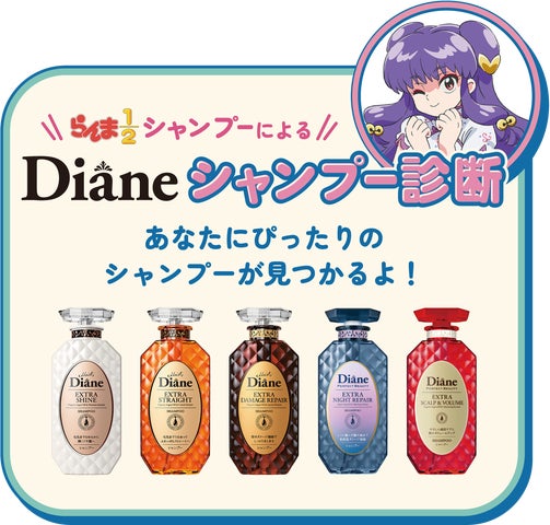 「私の髪にはどのシャンプーが合うの?」「種類が多くて選べない…」といった声に応え、楽しみながら自分にぴったりのヘアケアが見つかる診断コンテンツが用意されています。現在の髪の悩みだけでなく「なりたい髪」までを考慮し、「髪質 × 理想の仕上がり」に基づいて最適なダイアンシリーズを導き出します。いくつかの簡単な質問に答えるだけで、『らんま1/2』の人気キャラクター・シャンプーがあなたの髪質を診断し、ぴったりのシリーズを提案します。