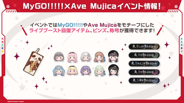MyGO!!!!!メンバーのイラストは、Ave Mujicaのキャラクターが一緒に描かれた特別仕様で登場。イベント報酬には、MyGO!!!!!やAve Mujicaをモチーフとしたライブブースト回復アイテムやピンズ、称号などが用意されています。