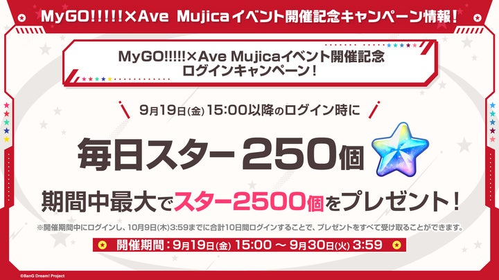 2025年9月19日(金)15時より、スマートフォン向けゲーム「バンドリ! ガールズバンドパーティ!」にて、MyGO!!!!!×Ave Mujicaのイベント「わかれ道をゆく人たちへ」が開催されます。本イベントでは最大スター2500個がもらえるログインキャンペーンも実施。開催内容や参加方法を詳しく紹介しますので、ぜひ参考にしてください。