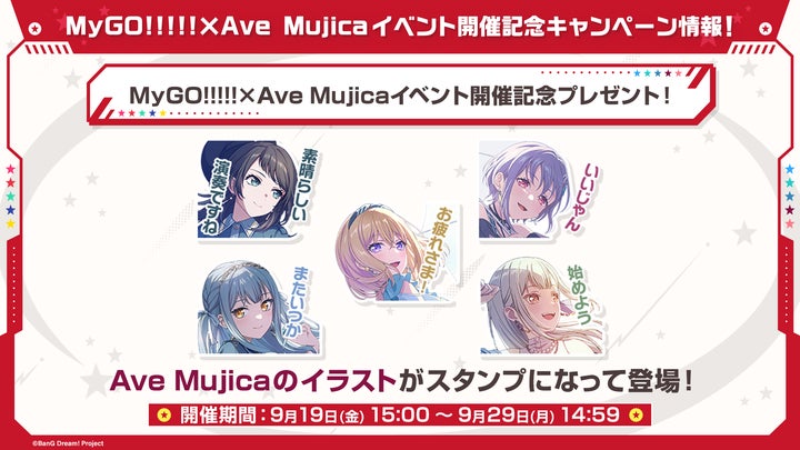 2025年9月19日(金)15時から9月29日(月)14時59分までの期間中にログインした方全員に、Ave Mujicaのスタンプがプレゼントされます。