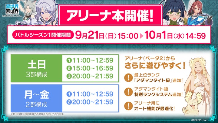 陣取りバトルが楽しめる「アリーナ」が、ついに本開催されます。期間中、特定の時間に開催されるため、自慢のパーティで挑戦することが可能です。「ベータ2」からはランクに「アダマンタイト級」が追加され、特別ランクシステムが解放されました。また、アリーナ用にオート機能が最適化され、より遊びやすくなっています。詳細はゲーム内のお知らせをご確認ください。