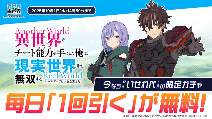 スマートフォン&PC向けゲーム『異世界∞異世界』にて、人気アニメ作品「異世界でチート能力を手にした俺は、現実世界をも無双する ~レベルアップは人生を変えた~」(以下、「いせれべ」)とのコラボレーションが、2025年9月21日(日)より開催されています。