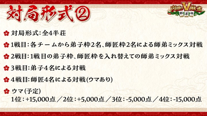 - 1名につき2半荘戦に参加し、合計4半荘戦が行われます。