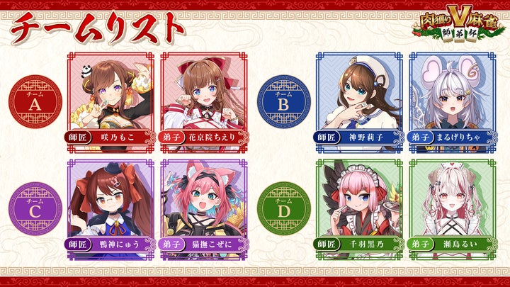 本イベントには、「.LIVE」および「ぶいぱい」所属タレントを含む総勢8名のVTuberが出場し、以下の師弟コンビ4チームで高級肉をかけた熱い戦いを繰り広げます。