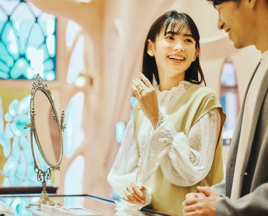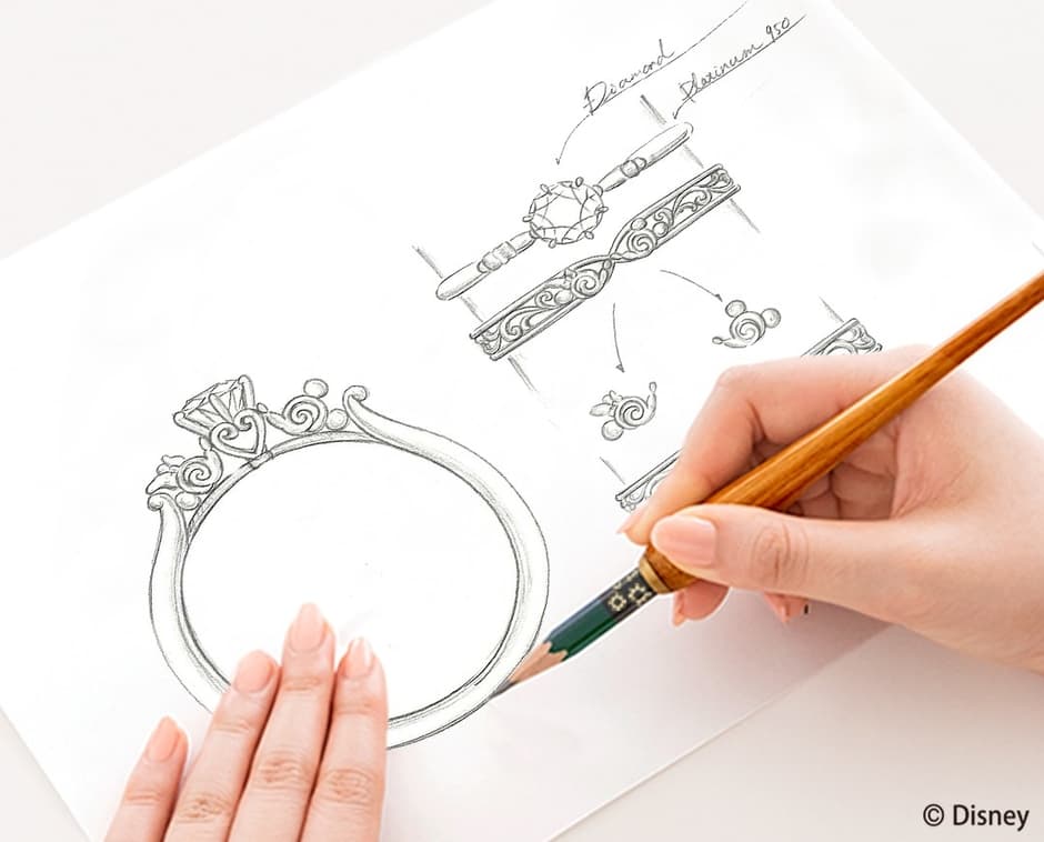 オーダーメイドブランドとして50万組以上のカップルに指輪を提案してきたケイウノは、創業以来40年以上かけて培われたメソッドを活かし、「パーソナルデザイン体験」を提供しています。お客様が自分たちだけでは気づけない「好き」や「似合う」を見つけ出し、お好きなディズニー作品やキャラクターをモチーフにデザインを描き起こすことも可能です。ふたりのためにパーソナライズされたデザインが生まれる感動体験は、ケイウノならではの魅力として好評を得ています。