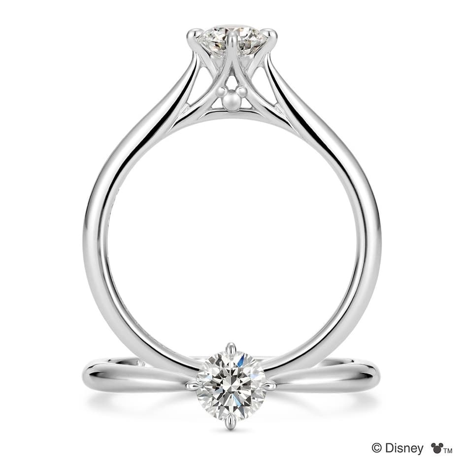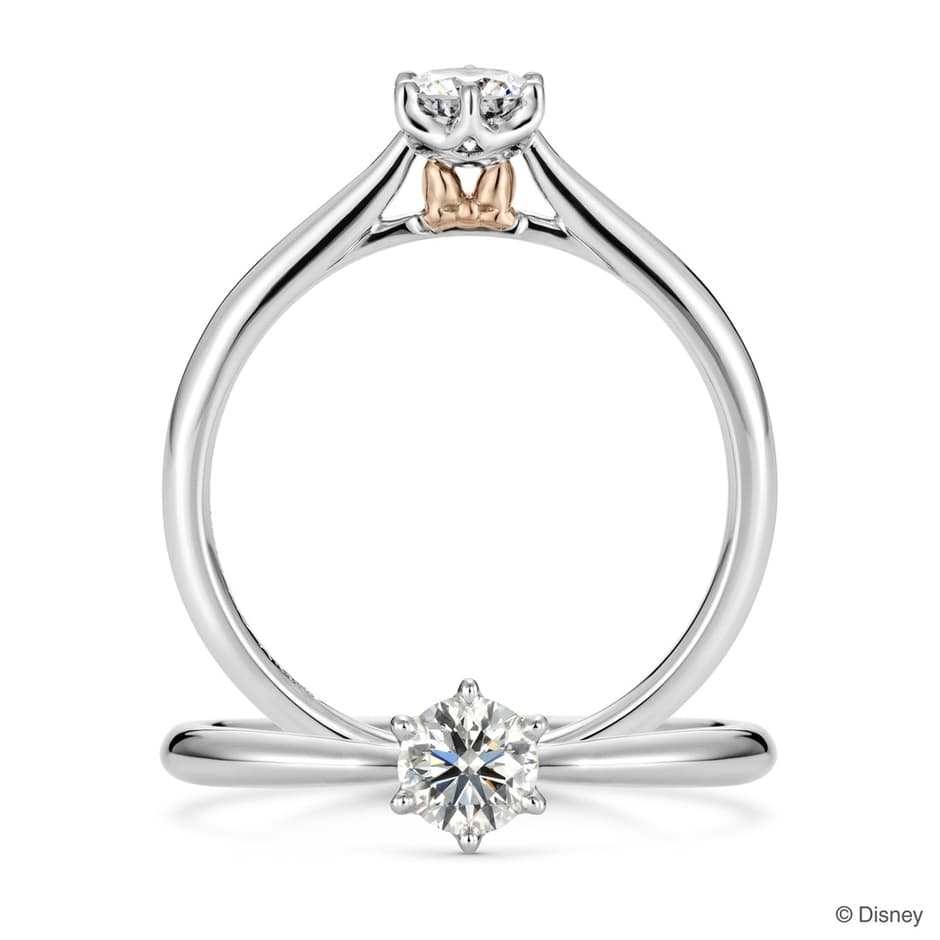 婚約指輪は、正面からはシンプルなソリティアデザインに見えます。しかし、石座の側面にはミニーマウスの象徴的なリボンがさりげなくデザインされています。このリボンがちらりと覗くことで、ピンクゴールドの甘く優しい印象が添えられ、正統派ながらも可愛らしさを感じさせる一品となっています。