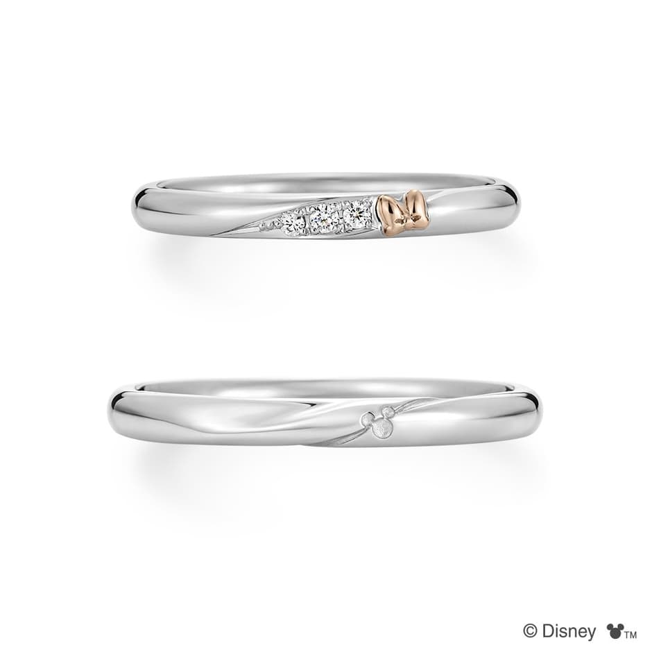 結婚指輪は、二つのリングが揃うことでミッキーとミニーのつながりを表現します。