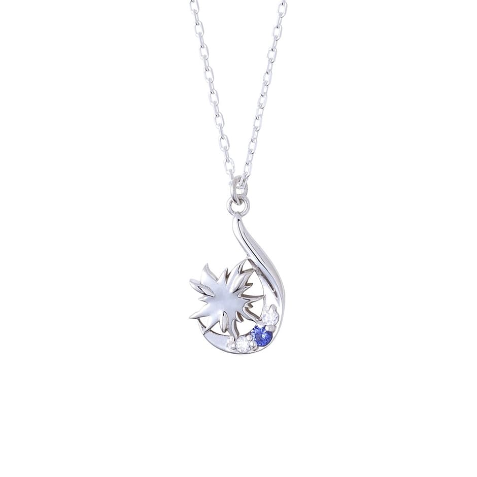 佳紀の魂の形をモチーフにしたトップには3石のストーンが配され、中心にはイメージカラーストーンが輝きます。エンドチャームには、ろうどうねこのヘアピンモチーフが取り入れられ、作品の世界観を表現するネックレスです。