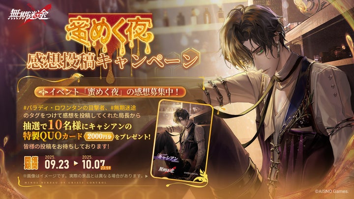 新イベント「蜜めく夜」の開催を記念し、感想投稿キャンペーンが9月23日(火)メンテナンス後より開催されます。「#パラディ・ロワンタンの目撃者」と「#無期迷途」の2つのタグをつけてイベントの感想を投稿すると、抽選で10名に新キャラクター「キャシアン」の特製QUOカード2,000円分が贈呈されます。詳細は公式X(旧Twitter)をご確認ください。