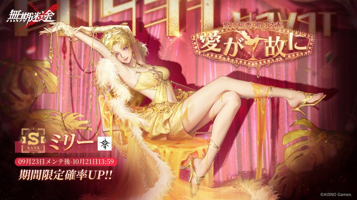 9月23日メンテナンス後から10月21日13:59までの期間、イベント逮捕「愛が故に」が開催されます。この期間中、新登場のS級コンビクト「ミリー」とA級コンビクト「キャシアン」を獲得できる機会があります。さらに、S級コンビクト「ミリー」、A級コンビクト「キャシアン」「無患子」「カメリアン」の獲得確率が上昇します。