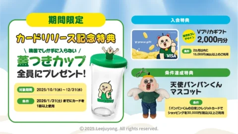 • 対象条件: 入会月+2カ月末日までに「パンパンくんの日常」クレジットカードを15,000円(税込)以上利用すると、「パンパンくんの日常」オリジナル描きおろしデザインのVプリカギフト2,000円分がプレゼントされます。