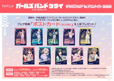 TVアニメ「ガールズバンドクライ」のグッズフェアが、2025年12月19日(金)よりアニメイトにて開催されます。東映アニメーション描き下ろしイラストを使用した限定グッズが登場し、購入・予約特典としてポストカードも配布。開催内容や参加方法を詳しく紹介するのでぜひ参考にしてください。