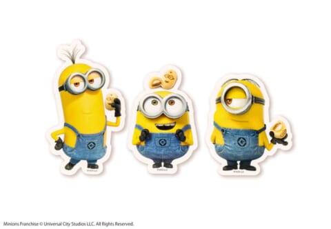 特に、8個入りの商品には「ミニオンinカンサイ」限定のオリジナルステッカーが付属します。ステッカーは、チョコバナナケーキと一緒に描かれたボブ、スチュアート、ケビンのいずれか1枚がランダムで封入されています。なお、4個入りにはオリジナルステッカーは付属せず、スポンジの絵柄はランダムのため、1箱に5種類すべてが揃わない場合があります。