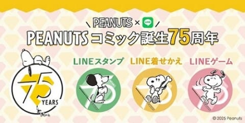 PEANUTSコミック誕生75周年(2025年10月2日)を記念し、株式会社テレビ東京コミュニケーションズより、アーティスト・長場雄氏が書き下ろしたPEANUTSのLINEスタンプとLINE着せかえが2025年10月2日から発売されました。