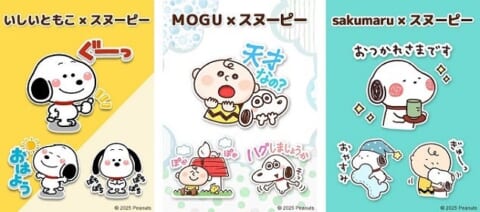 長場雄氏のほかにも、人気イラストレーターであるいしいともこ氏、MOGU氏、sakumaru氏が描き下ろしたスヌーピーのコラボLINEスタンプが配信中です。