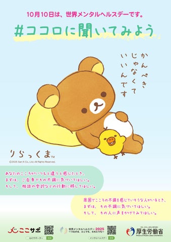10月10日の「世界メンタルヘルスデー」に伴い、厚生労働省が実施する「世界メンタルヘルスデー2025」の応援サポーターに、リラックマが2年連続で就任しました。メンタルヘルスに関する世間の意識向上と正しい知識の普及を目指す取り組みです。