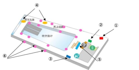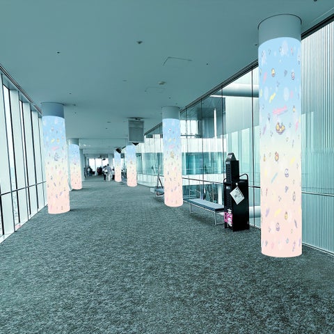 展望台の60階「天上回廊」では、景色とすみっコたちとの写真が撮れる「展望台ゲートフォトスポット」をはじめ、「ぬいぐるみ立体フォトスポット」、「パネル型フォトスポット」、「てのりぬいぐるみフォトスポット」など、複数のフォトスポットが設置されます。さらに、エスカレーターガラスラッピングや展望台柱ラッピングも施され、すみっコぐらしの世界観が演出されます。