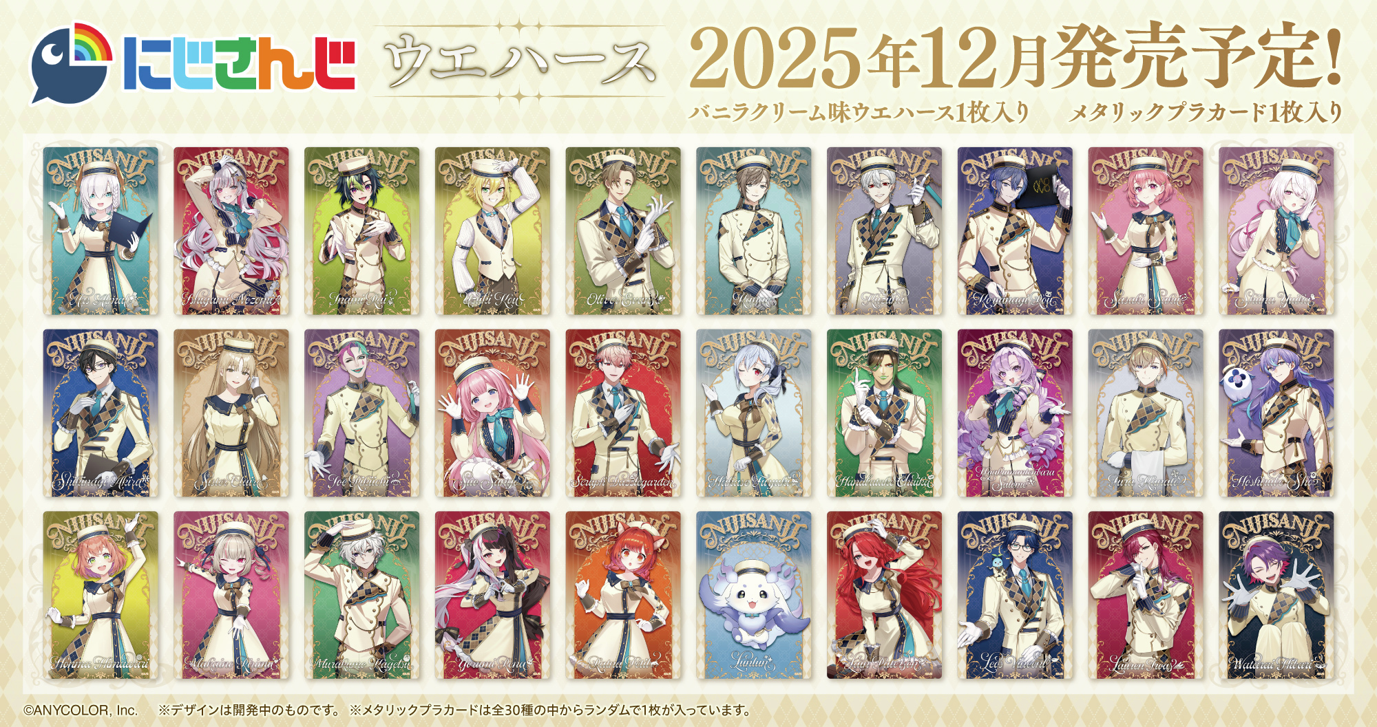 VTuberグループ「にじさんじ」のライバー30名が、お菓子をイメージしたコンシェルジュ衣装で登場するカード付きウエハースが2025年12月に発売予定です。全カードデザインが解禁され、その詳細が明らかになりました。