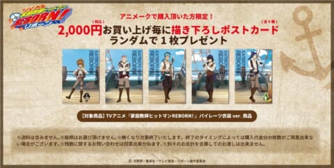 TVアニメ「家庭教師ヒットマンREBORN!」の描き下ろしパイレーツ衣装グッズは、「アニメーク」にて購入が可能です。この機会にぜひ、お気に入りのアイテムを手に入れてみてはいかがでしょうか。