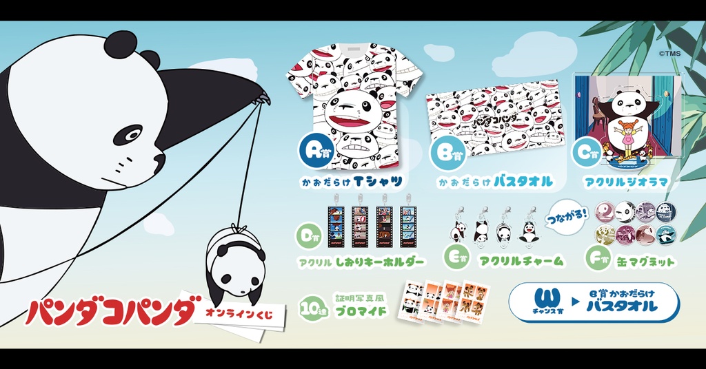 本オンラインくじでは、パンダコパンダの可愛いシーンを使用した、かおだらけアイテムをはじめとするバリエーション豊かな景品が用意されています。