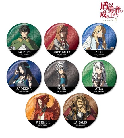 岩谷尚文、ラフタリア、フィーロ、サディナ、フォウル、アトラ、ヴァルナール、ジャラリスのイラストを缶バッジに仕上げたアイテムです。