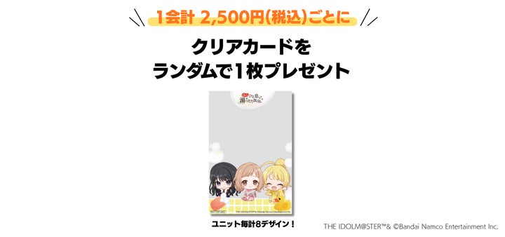 コラボグッズのお会計2,500円(税込)毎に、「特典クリアカード(ユニット毎全8種)」がランダムで1枚進呈されます。ランダム配布のため絵柄は選択できません。この特典は各施設の売店・飲食のお会計は対象外であり、配布期間中であっても各施設の在庫がなくなり次第終了となります。
