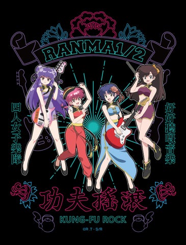 TVアニメ「らんま1/2」から、らんま、あかね、シャンプー、右京たちのガールズロックバンド「KUNG FU ROCK(カンフーロック)」をコンセプトとしたオリジナル描き下ろしイラストのグッズが、ヴィレッジヴァンガードオンラインにて予約販売されています。チャイナドレスとロックを融合させたレトロ感のある中華テイストが特徴です。