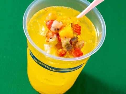 - ワインカクテル: 鮮やかな黄色が目を引く一品。キウイフルーツ、ストロベリー、マンゴーのダイスがトッピングされ、クリスマスの華やかな雰囲気にぴったりです。