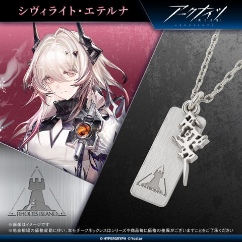 オペレーター「シヴィライト・エテルナ」の武器をチャームのデザインに落とし込んだプレートネックレスです。プレート部分には、所属陣営であるロドスのエンブレムが刻印されています。 |