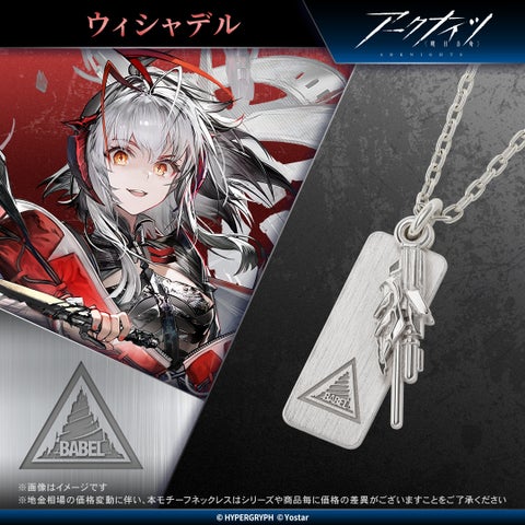 オペレーター「ウィシャデル」の武器をチャームのデザインに落とし込んだプレートネックレスです。プレート部分には、所属陣営であるバベルのエンブレムが刻印されています。 |