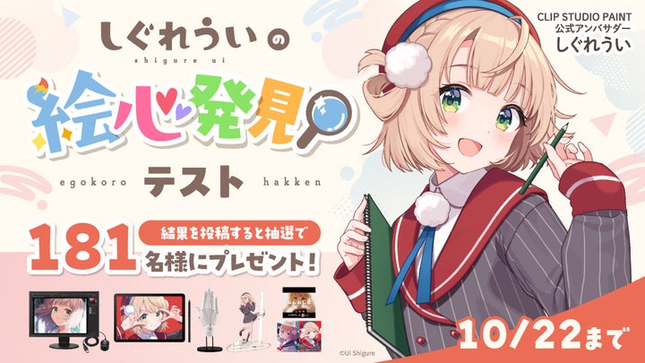 イラストレーターのしぐれうい先生とCLIP STUDIO PAINTのコラボレーションによる「しぐれういの絵心発見テスト」キャンペーンが、2025年10月8日(水)より開催されます。本テストでは、あなたの隠れた創作能力と作風を診断し、さらにテスト結果をSNSに投稿することで、抽選で181名様に豪華賞品やしぐれうい先生の関連グッズがプレゼントされます。開催内容や参加方法を詳しく紹介しますのでぜひ参考にしてください。