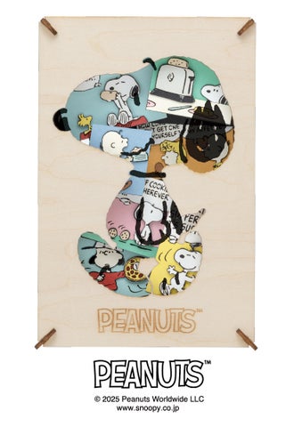 奥行きを活かしたレイヤー構造により、裏面にはスヌーピーの後ろ姿が描かれており、前後どちらからも楽しめる2way仕様に仕上がっています。お部屋のインテリアとしても映えるウッドスタイルのアートは、PEANUTSファンにとって魅力的なアイテムです。