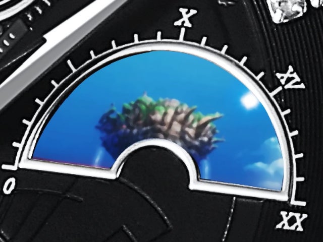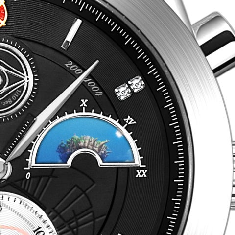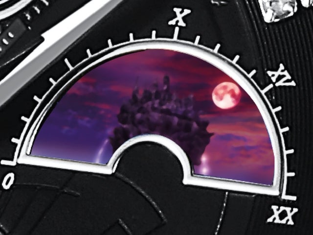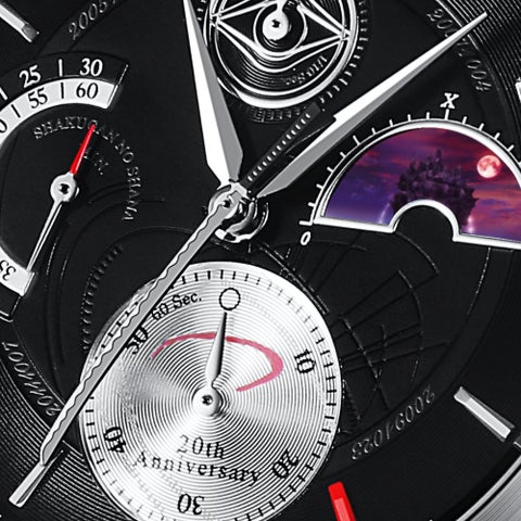ムーンフェイズには「天道宮」と「星黎殿」がモチーフとして採用され、「現世」と「紅世」が交差するシャナの世界観を表現しています。文字盤の裏側にあるディスクが一定の周期で一周することで、時間の流れとともに景色が静かに変化し、腕元に物語の情景を映し出します。午前には天道宮、午後には星黎殿のイメージがそれぞれ現れます。